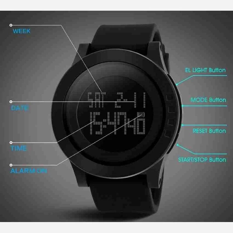 ویژگیهای ساعت قابلیت نمایش 24 ساعته، تاریخ شمار، نور پس زمینه، تایمر، آلارم