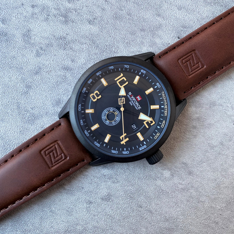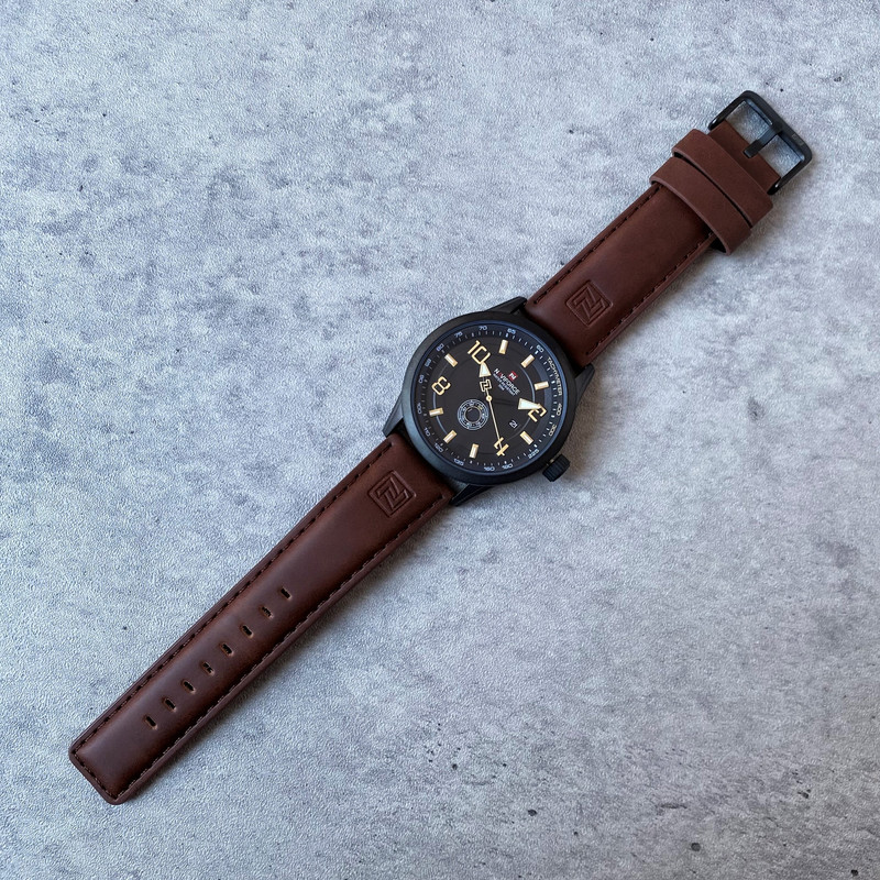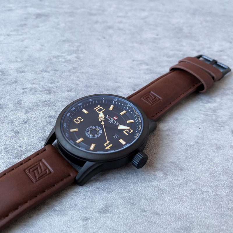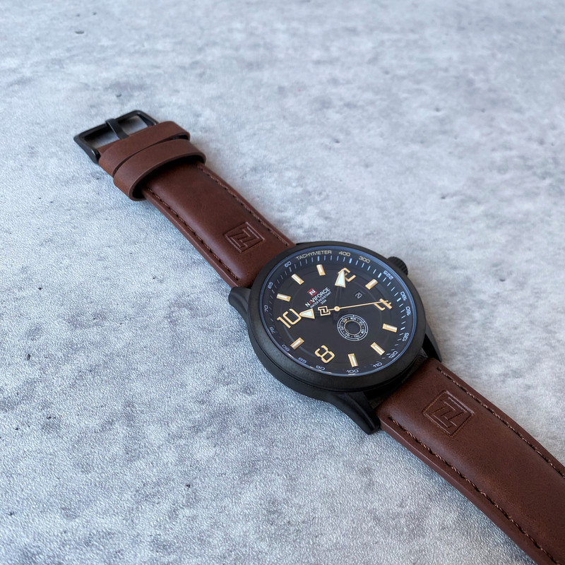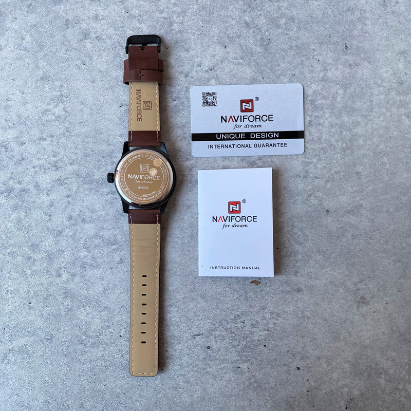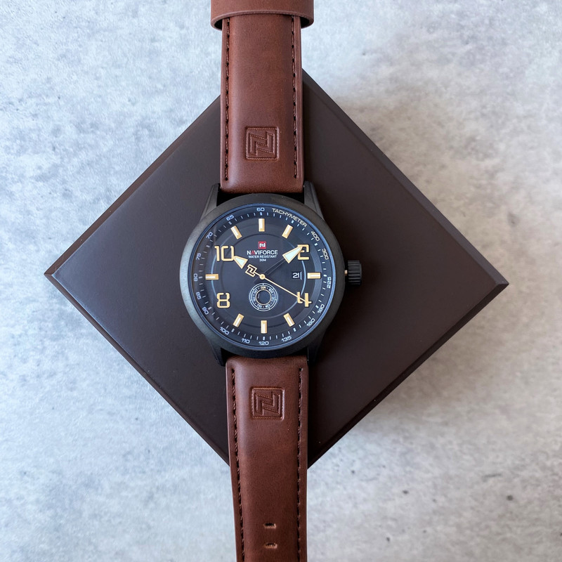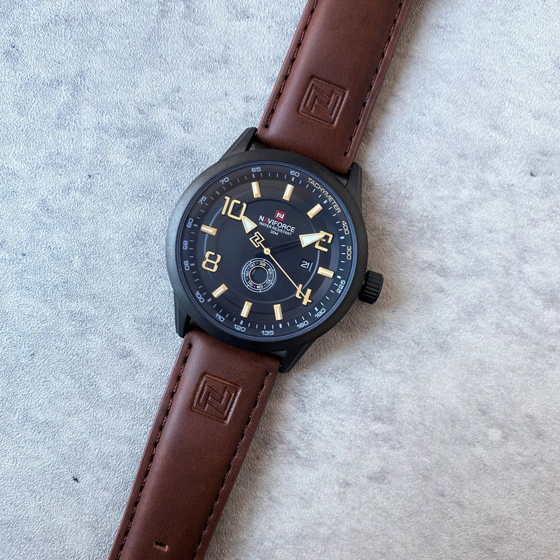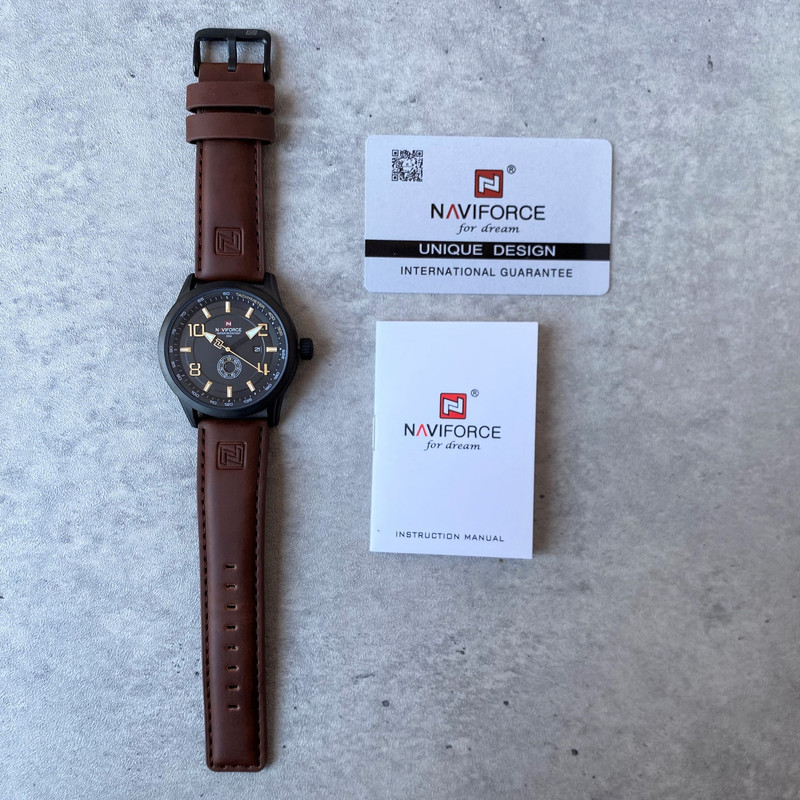 این مدل از ساعت مچی های مردانه برند نیوی فورس بر اساس سبک کلاسیک و اسپرت و روزمره بوده و دارای طراحی بسیار زیبایی می باشد.شیشه ی معدنی ضد خش و بند چرمی بسیار باکیفیت و بدنه ی این ساعت استیل رنگ ثابت بوده که از ترکیب رنگ های مشکی و قهوه ای در آن استفاده شده است و جزو ساعت های خوش فروش برند نیوی فورس است و جزو بهترین و مناسب ترین ایده ها برای کادوی مردانه در مناسبت های مختلف میباشد. طراحی متفاوت این ساعت چشم هر بیننده ای را مینوازد. همچنین این ساعت دارای نمایشگر روزهای ماه و هفته و عقره های شب تاب نیز میباشد. و دارای 30متر مقاومت در برابر آب است. همچنین روی قفل و روی سرکوک ساعت و روی عقربه ی ثانیه شمار و صفحه ی ساعت و پشت درب برند نیوی فورس حک شده است. و همانطور که مشاهده میکنید دارای هولوگرام پشت درب و دفترچه نیز میباشد.