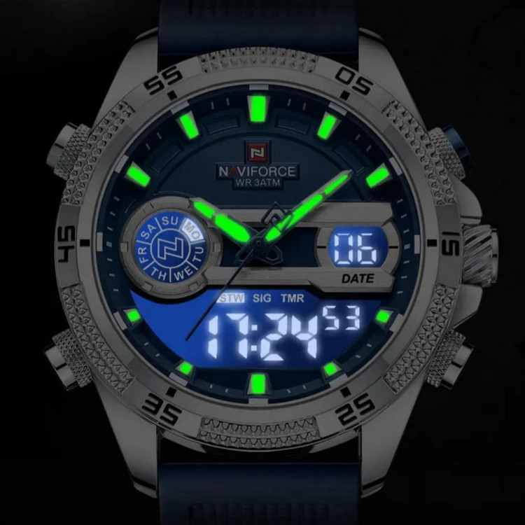 نمایش 24 ساعته , نمایش ساعت دوم , تاریخ شمار , نور پس زمینه , تایمر , عقربههای شبتاب , آلارم , شیشه ضدخش