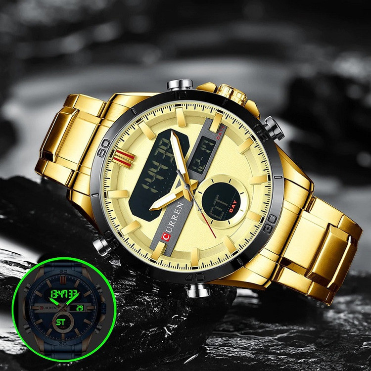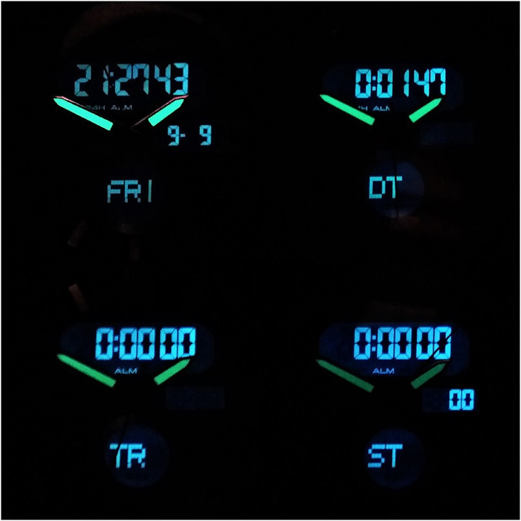 قابلیتهای ساعت : نمایش 24 ساعته , نمایش ساعت دوم , نور پس زمینه , تاریخ شمار , آلارم , تایمر , عقربههای شبتاب